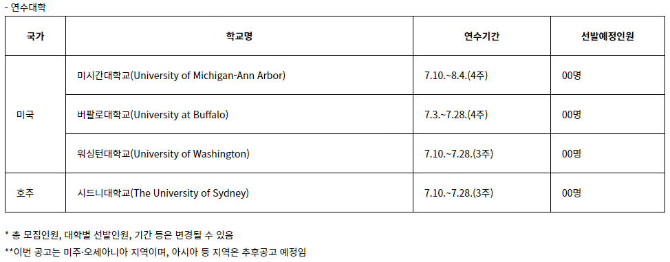 ※ 요구 비자 ESTA, J1 등 대학별 상이(추후 공지)